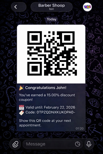- The coupon is sent to the client via Telegram or WhatsApp