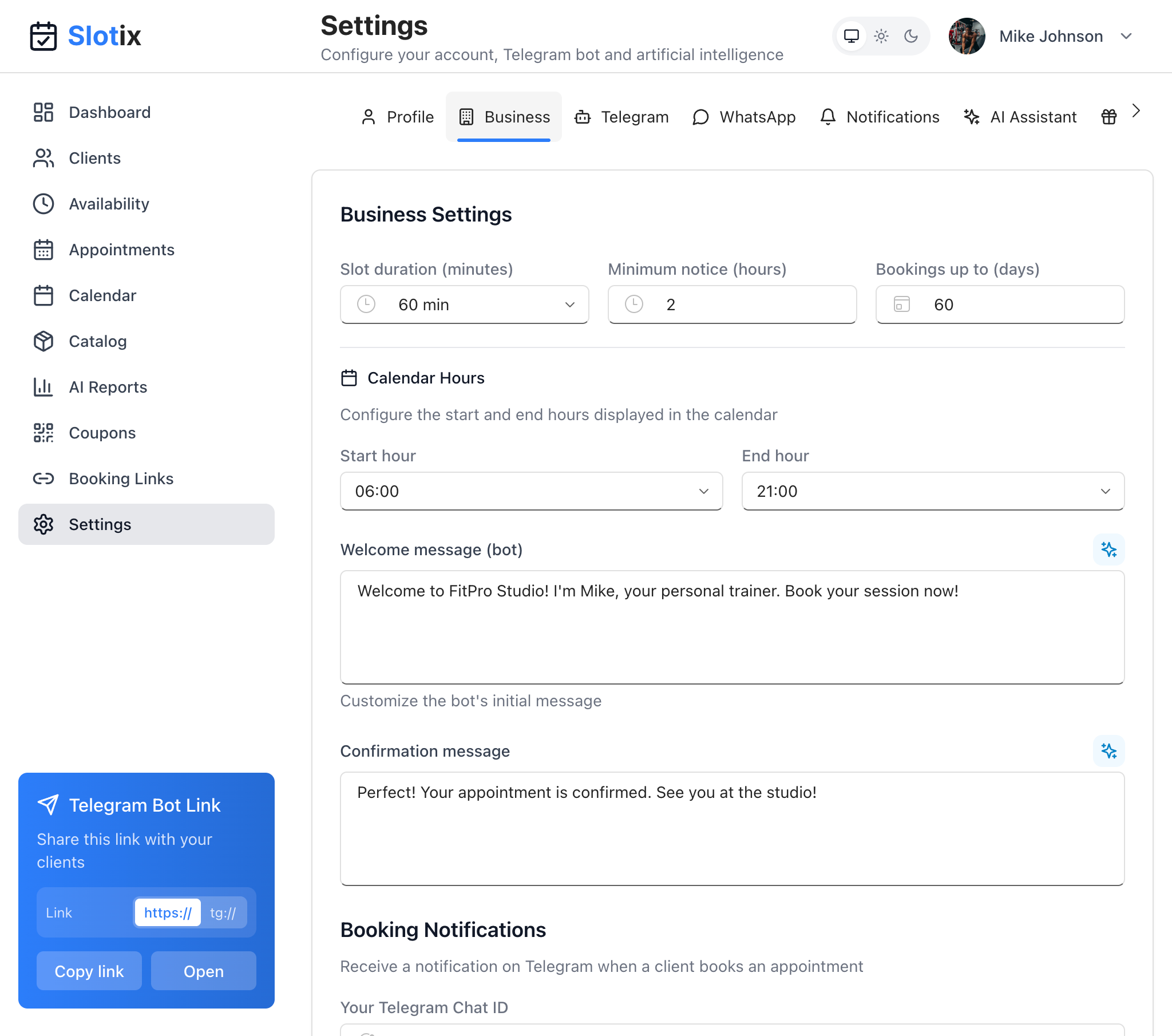 Access settings from any page by clicking Settings in the sidebar. Use the tab navigation to quickly jump to the section you need.